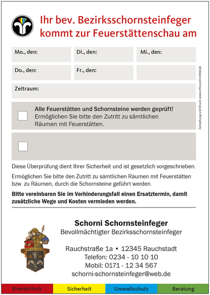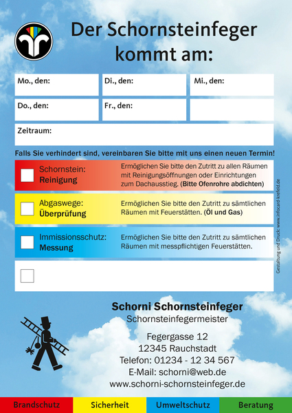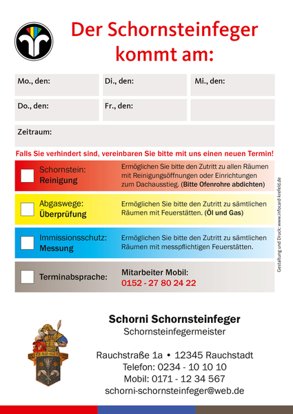 Die Anmeldezettel erhalten Sie für Schornsteinfeger/in und Kaminkehrer/in - inklusive Erstgestaltung mit Ihren Kontaktdaten und einer Änderung