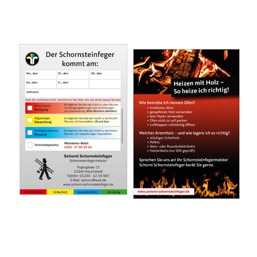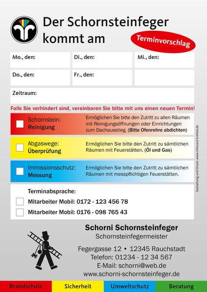 Die Anmeldezettel erhalten Sie für Schornsteinfeger/in und Kaminkehrer/in - inklusive Erstgestaltung mit Ihren Kontaktdaten und einer Änderung